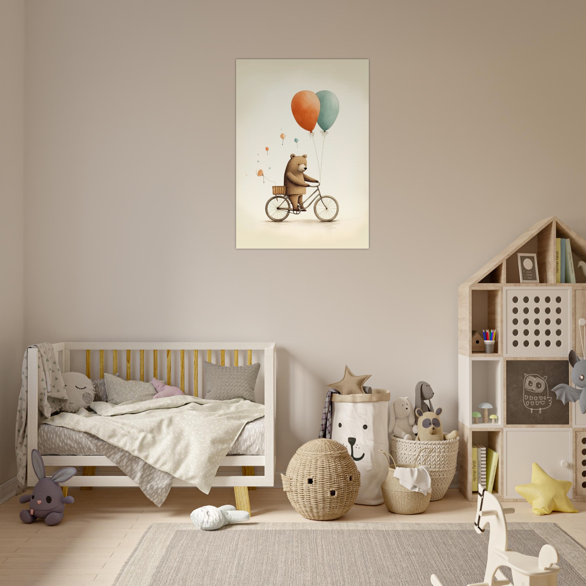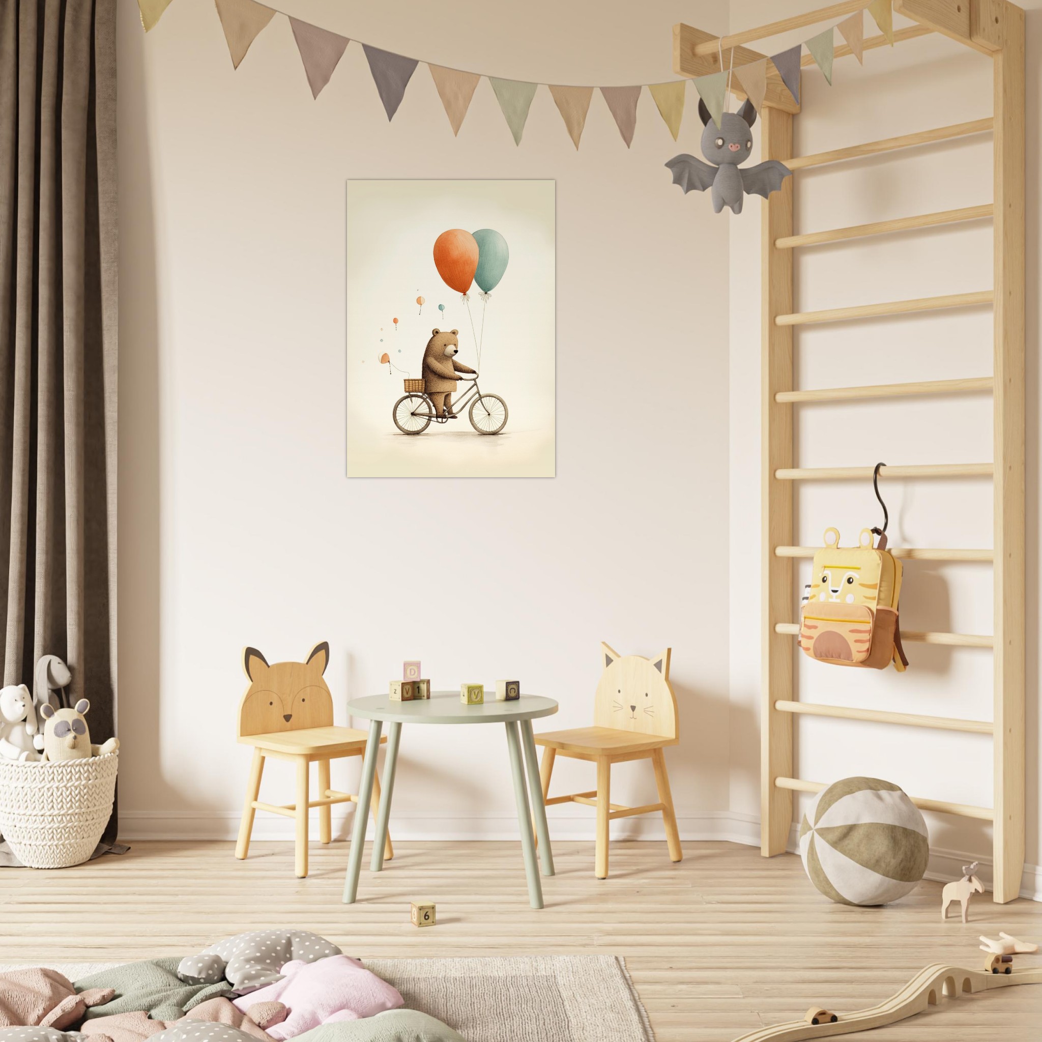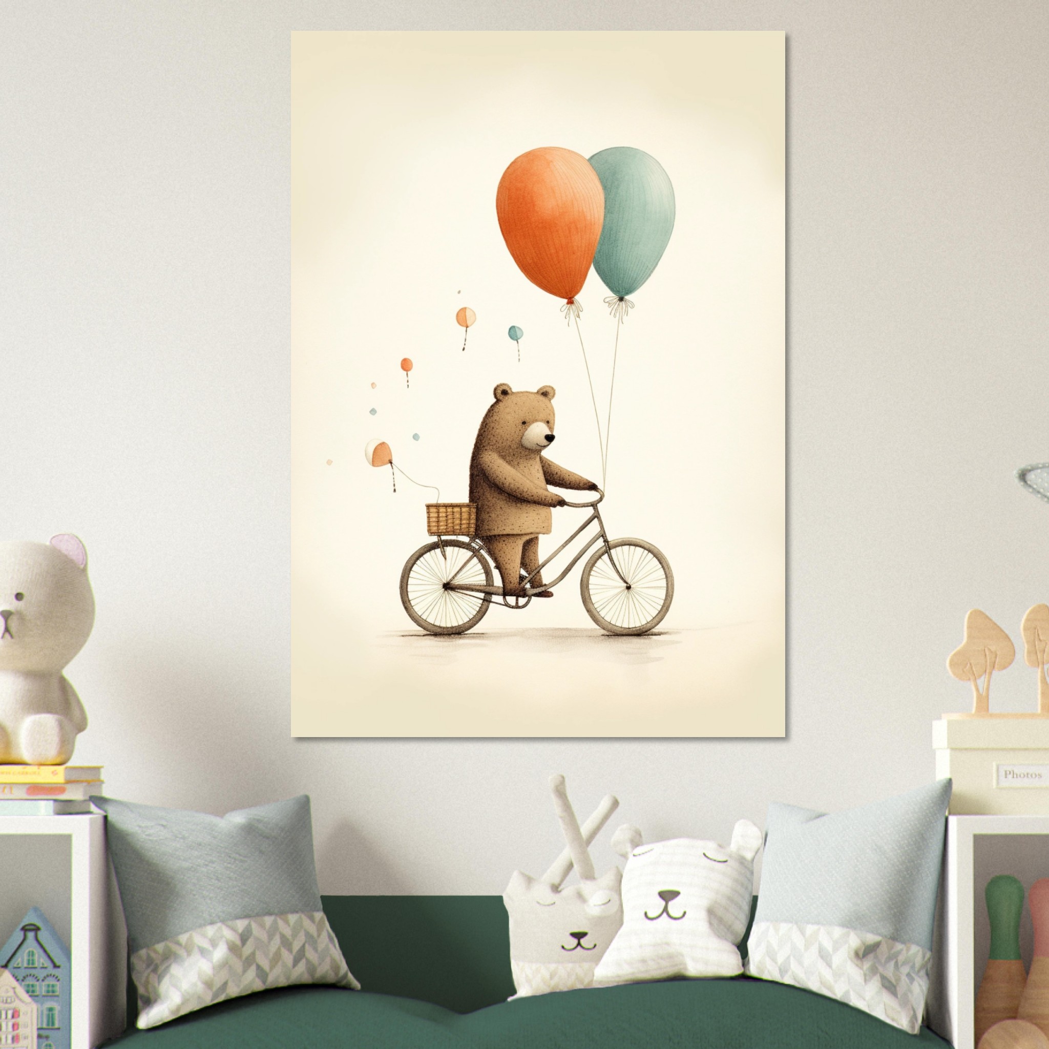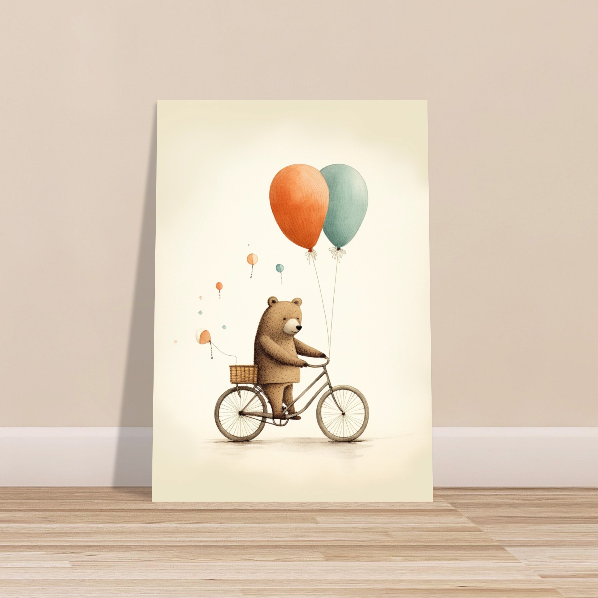 “Ballonnenbeer op fiets” – deze schattige beer brengt kleur en vreugde in de kinderkamer terwijl hij op zijn fiets rondrijdt met een bos ballonnen. Een speelse toevoeging aan de kamer die de verbeelding van je kleintje zal stimuleren. Laat de beer op avontuur gaan en ontdek meer charmante Kinderkamer Posters om de kamer op te vrolijken met dit vrolijke tafereel.