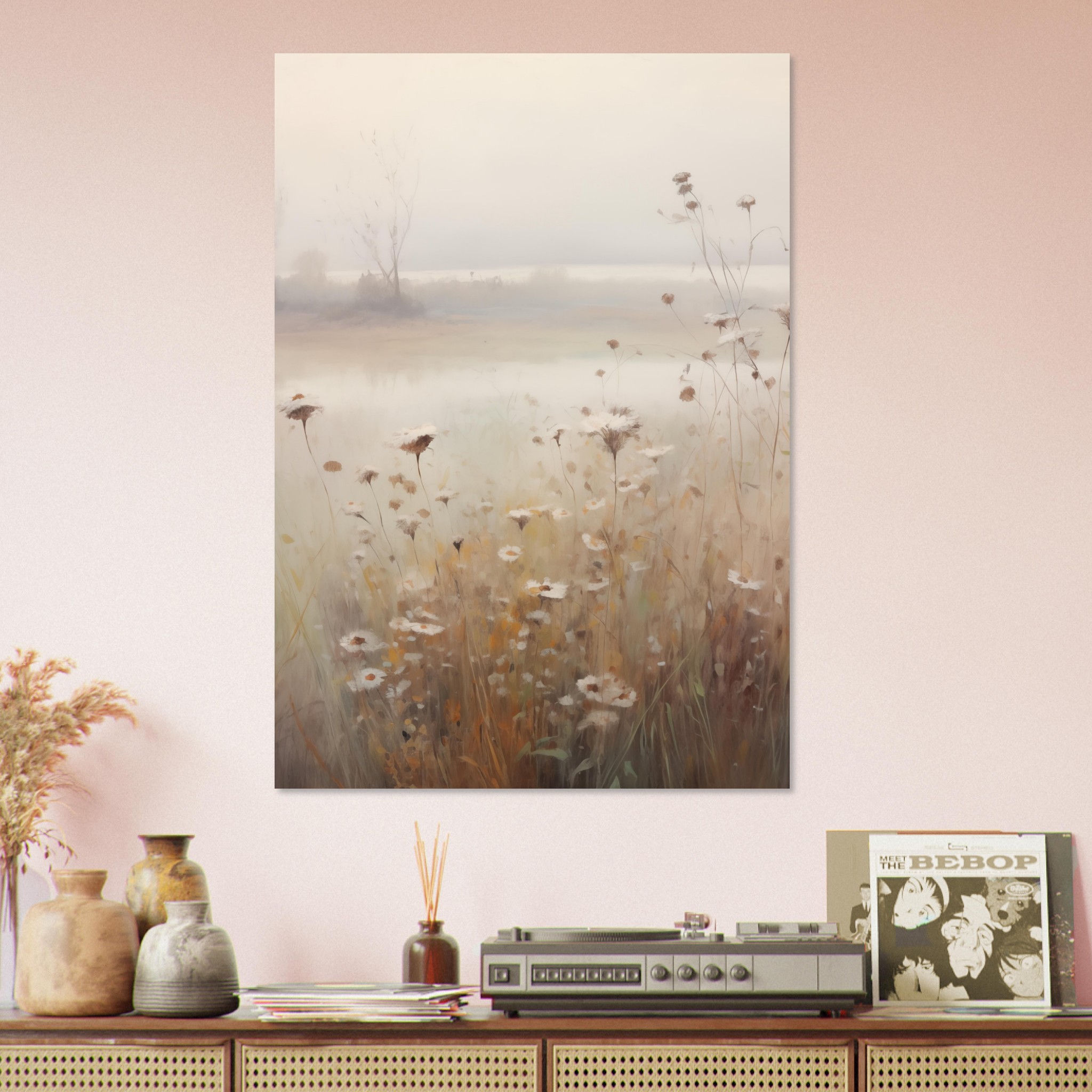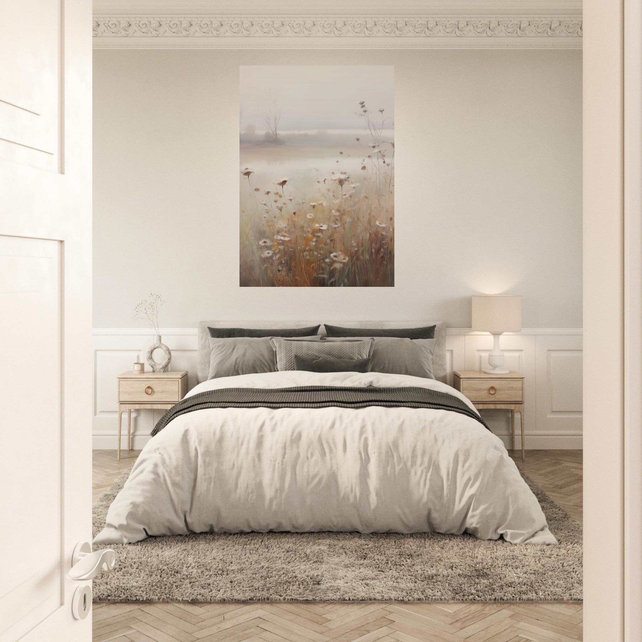 Laat je betoveren door de dromerige sfeer van ‘Foggy Flowerfield’. Deze poster vangt de mystieke schoonheid van een bloemenveld gehuld in mist, wat zorgt voor een rustgevend en betoverend beeld. De subtiele kleuren en zachte contouren creëren een gevoel van sereniteit en poëzie, waardoor het een perfecte keuze is voor een kalmerende en inspirerende toevoeging aan je interieur. Deze poster past uitstekend in ruimtes waar je een oase van rust wilt creëren,zoals slaapkamers of meditatieruimtes. ‘Foggy Flowerfield’ nodigt uit tot reflectie en ontspanning, en voegt een uniek en sereen element toe aan je leefomgeving.