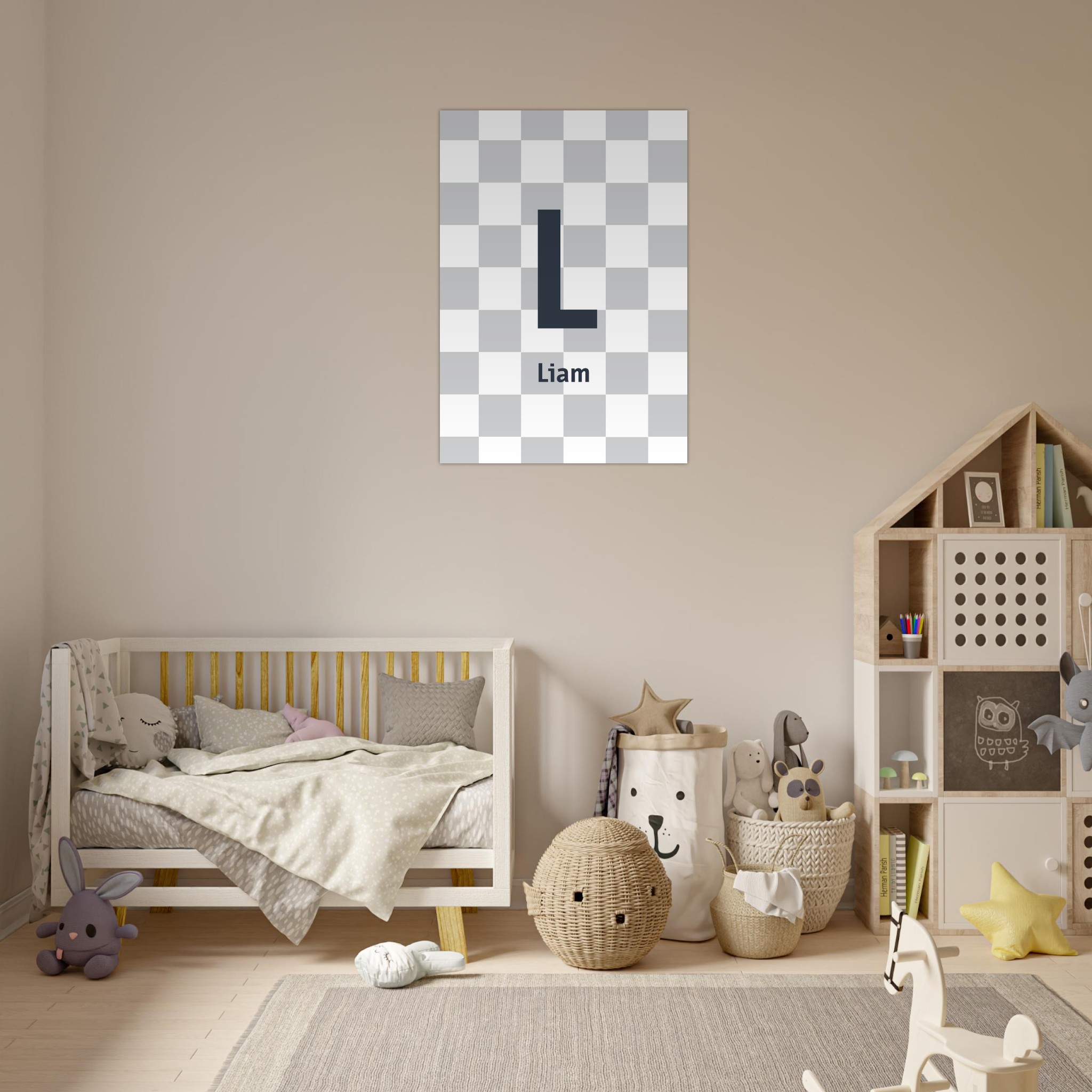 Voeg een stoere touch toe aan elke kinderkamer met deze ‘Kindernaam Liam’ poster. De poster, met een opvallende weergave van de naam Liam, heeft een geblokte lichtgrijze achtergrond die zowel neutraal als stijlvol is. Deze eenvoudige en toch krachtige ontwerp maakt het een perfecte aanvulling op iedere kinderkamer, ongeacht de inrichting of thema. Het is een leuke en persoonlijke manier om de ruimte van je kind een uniek en stoer karakter te geven.
