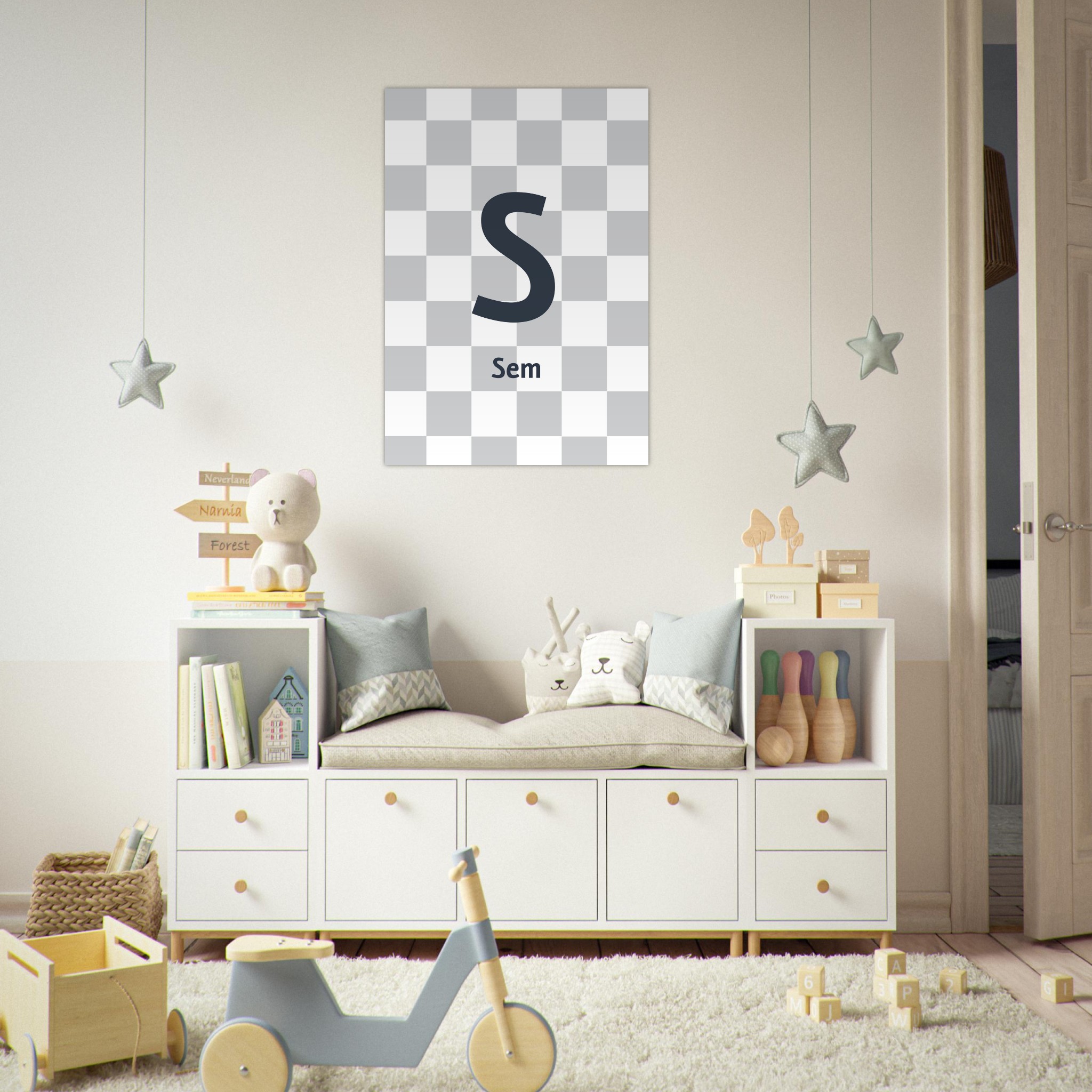 Voeg een stoere touch toe aan elke kinderkamer met deze ‘Kindernaam Sem’ poster. De poster, met een opvallende weergave van de naam Sem, heeft een geblokte lichtgrijze achtergrond die zowel neutraal als stijlvol is. Deze eenvoudige en toch krachtige ontwerp maakt het een perfecte aanvulling op iedere kinderkamer, ongeacht de inrichting of thema. Het is een leuke en persoonlijke manier om de ruimte van je kind een uniek en stoer karakter te geven.