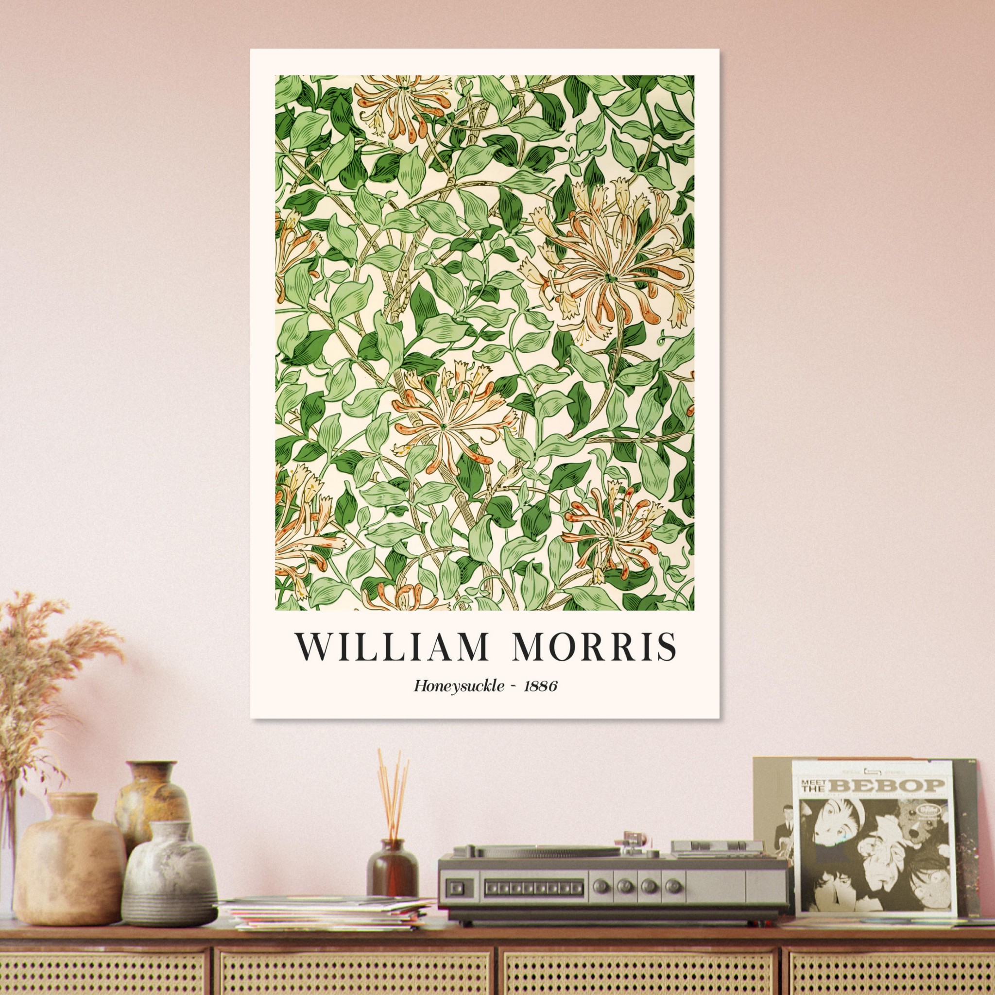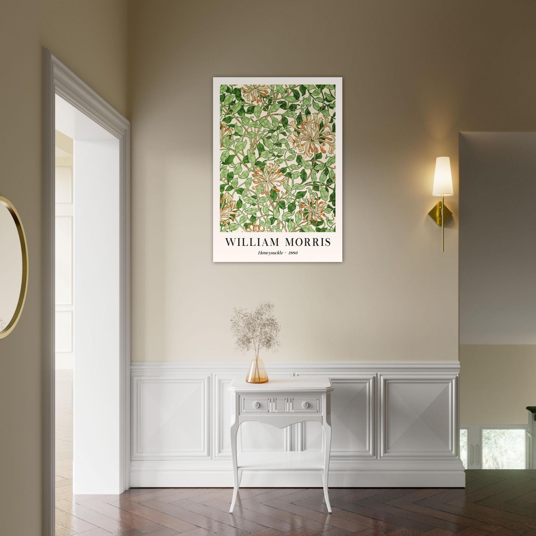 Beleef de verfijnde esthetiek van de late 19e eeuw met ‘Honeysuckle – 1886’ van William Morris. Dit kunstwerk, een symfonie van vorm en kleur, illustreert Morris’ fascinatie voor de natuurlijke wereld, met name de sierlijke kamperfoelie. De zorgvuldig samengestelde compositie, rijk aan detail en diepte, brengt een stukje van de natuurlijke wereld binnenshuis. Dit stuk straalt een gevoel van rustieke elegantie uit, perfect voor liefhebbers van zowel botanische kunst als historisch design. Laat ‘Honeysuckle – 1886′ een sfeervolle en artistieke touch aan je interieur geven, waarbij het de tijdloze schoonheid en het vakmanschap van Morris’ werk viert.