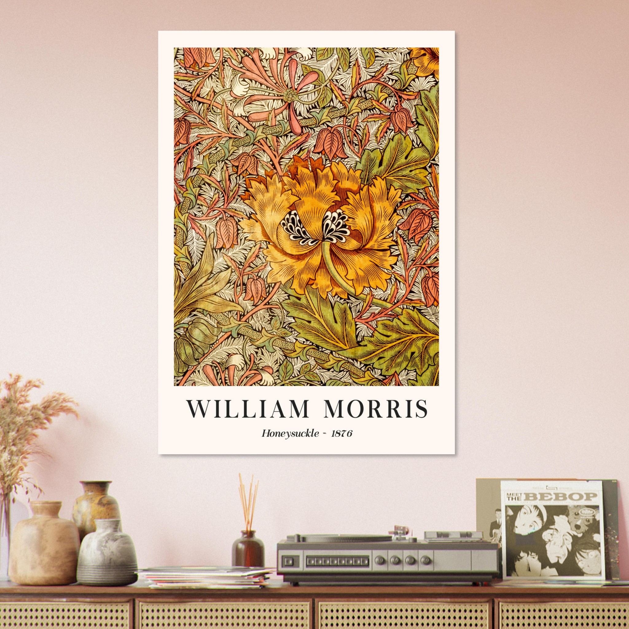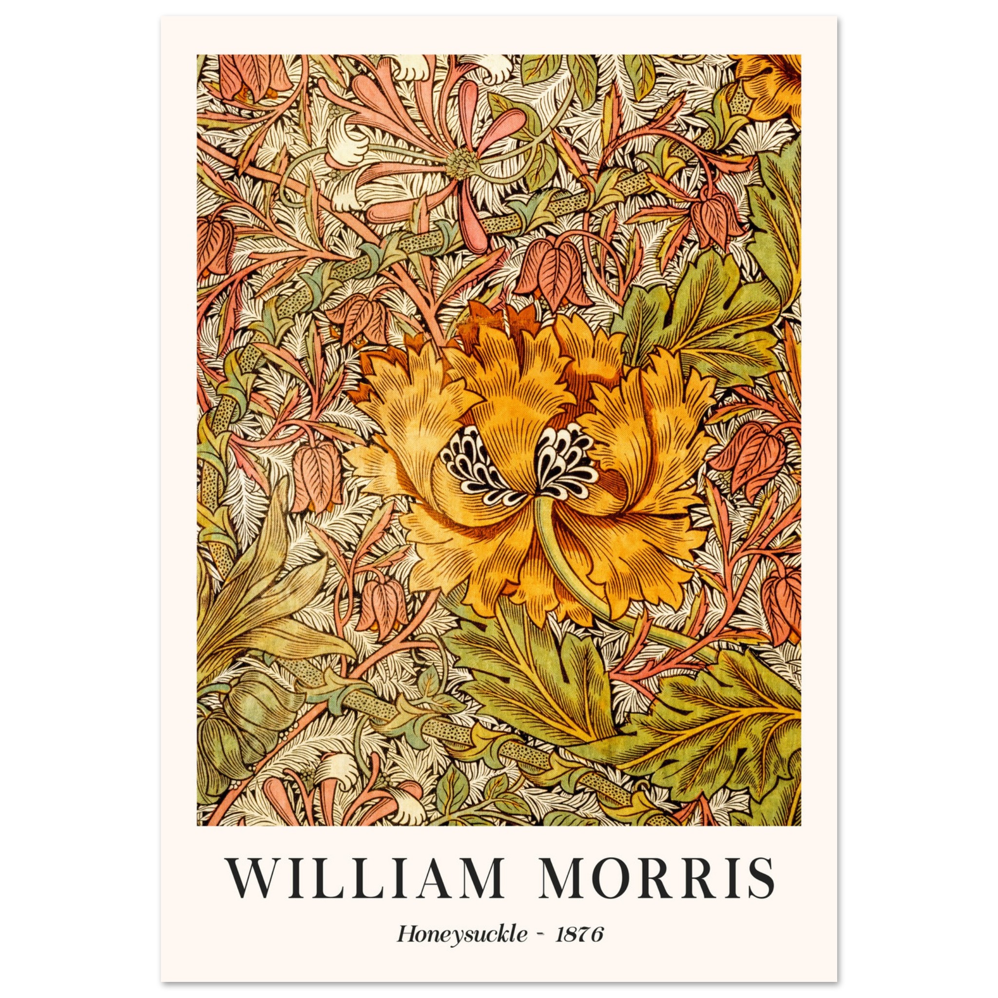 Beleef de verfijnde esthetiek van de late 19e eeuw met ‘Honeysuckle II – 1886’ van William Morris. Dit kunstwerk, een symfonie van vorm en kleur, illustreert Morris’ fascinatie voor de natuurlijke wereld, met name de sierlijke kamperfoelie. De zorgvuldig samengestelde compositie, rijk aan detail en diepte, brengt een stukje van de natuurlijke wereld binnenshuis. Dit stuk straalt een gevoel van rustieke elegantie uit, perfect voor liefhebbers van zowel botanische kunst als historisch design. Laat ‘Honeysuckle – 1886′ een sfeervolle en artistieke touch aan je interieur geven, waarbij het de tijdloze schoonheid en het vakmanschap van Morris’ werk viert.