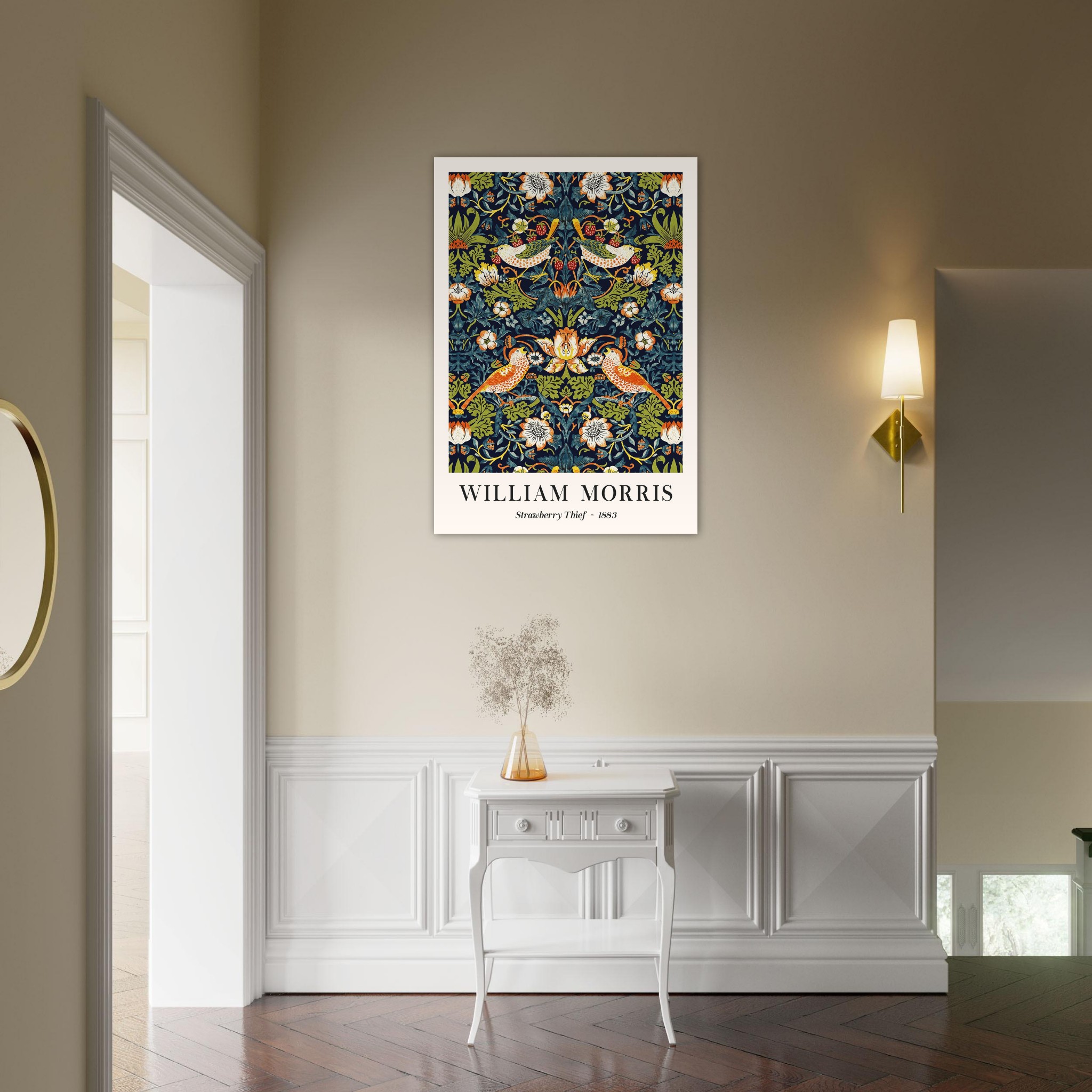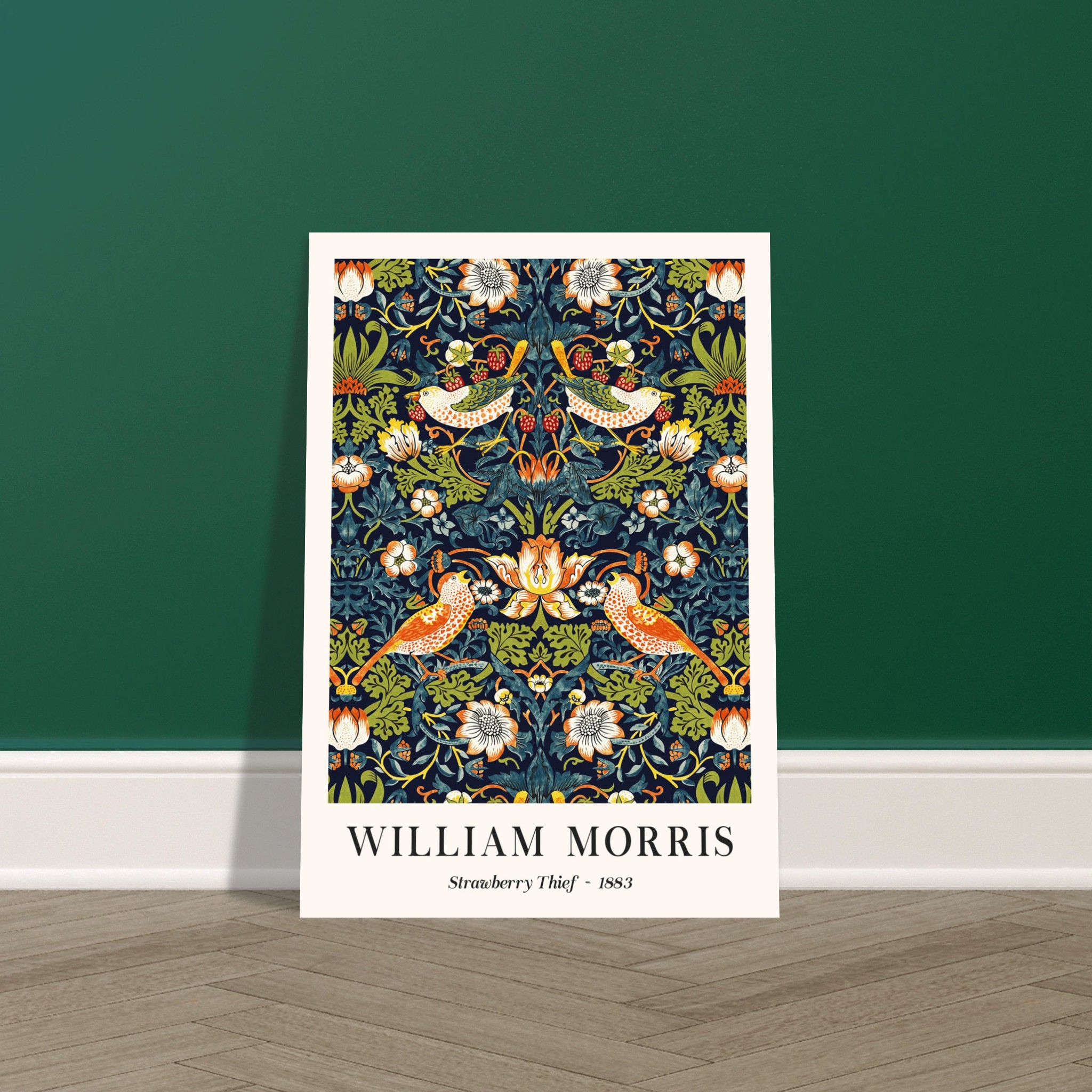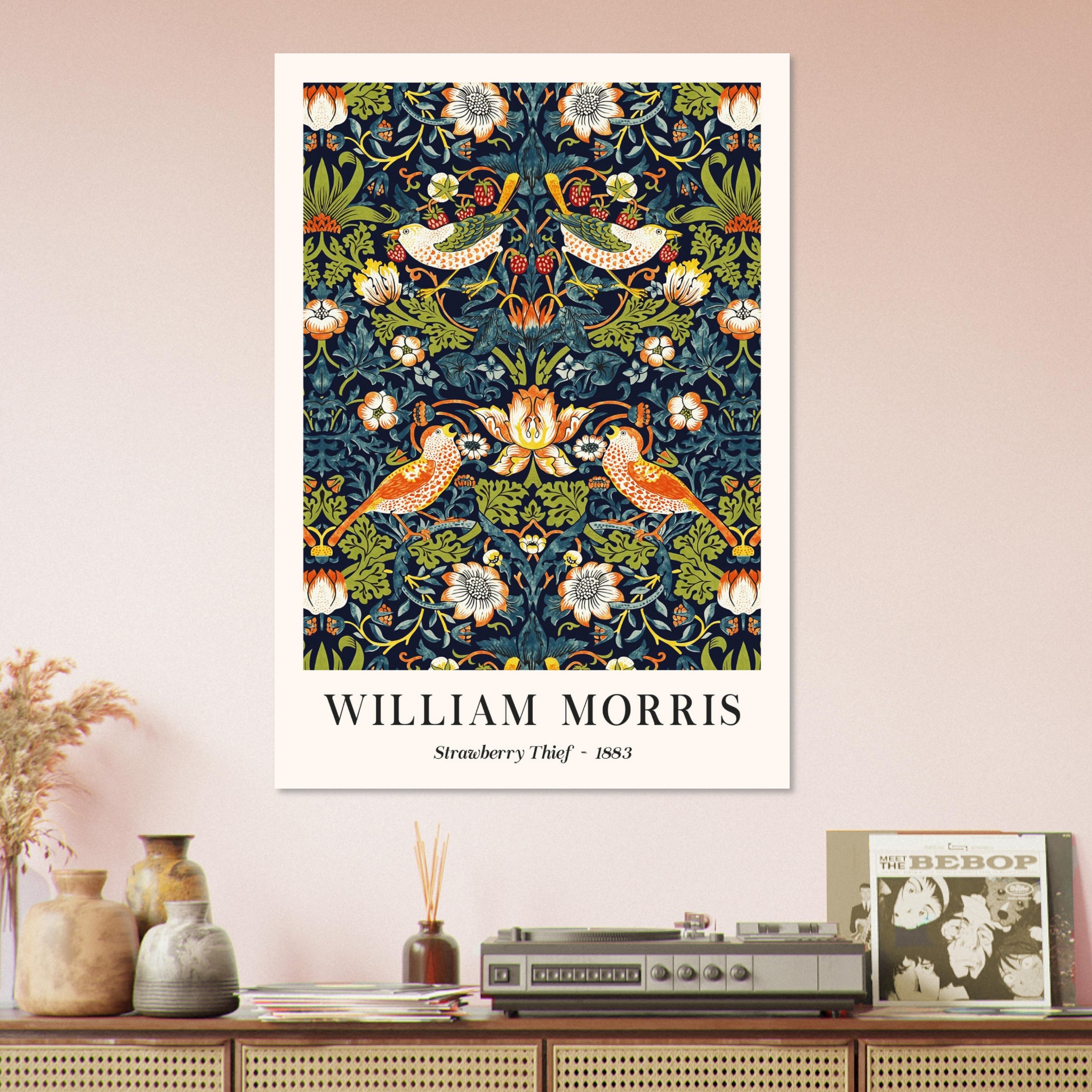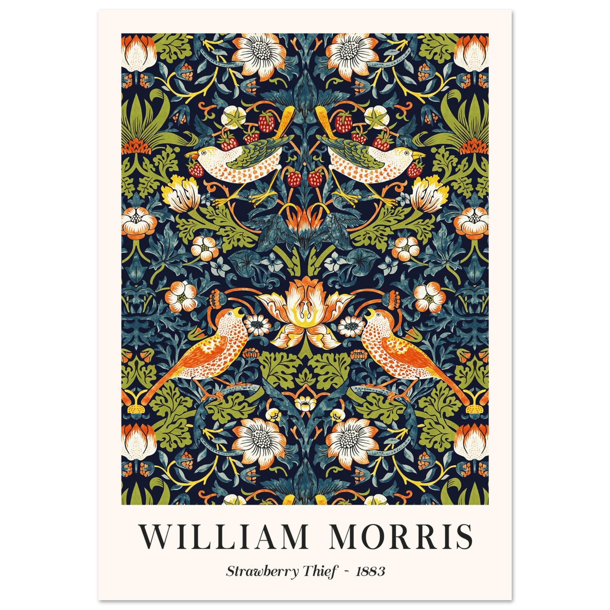 Laat je betoveren door ‘Strawberry Thief – 1883’, een van William Morris‘ meest geliefde ontwerpen. Deze poster toont het charmante tafereel van vogels die stiekem aardbeien stelen, omgeven door weelderige planten en bloemen. De rijke kleuren en gedetailleerde patronen zijn kenmerkend voor Morris’ werk en brengen een vleugje natuur en speelsheid in elke ruimte. Deze klassieker uit de Arts and Crafts-beweging is perfect voor wie zijn interieur wil verrijken met een stukje historische kunst en design. ‘Strawberry Thief’ voegt niet alleen schoonheid toe, maar ook een verhaal en karakter aan je thuis.
